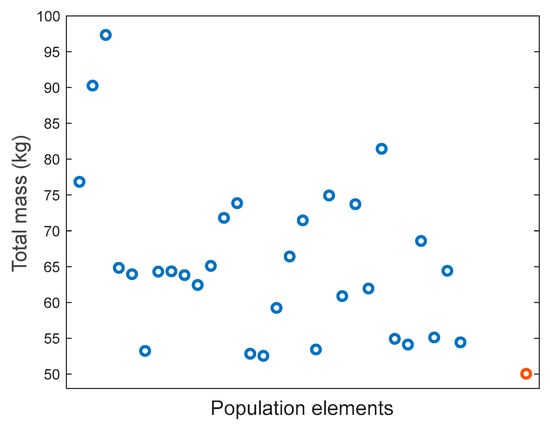 In Equations (17)–(20), the functions unifrndint and unifrnd generate a random integer number (lower than np, which indicates the number of population elements) and a real random number (lower than 1) using a uniform distribution. The ranges , , , and could be chosen or with the use of analytical formulation or through some initial simulations able to find an opportune maximum value of the parameters. The latter solution is adopted in the paper.