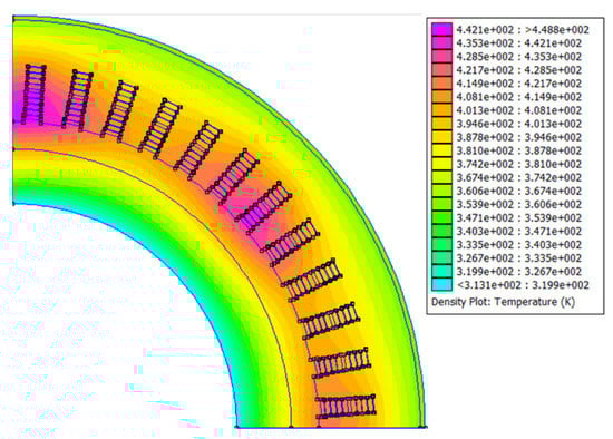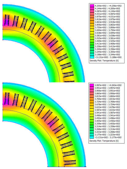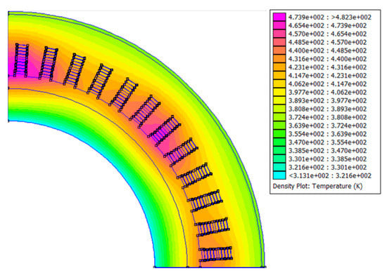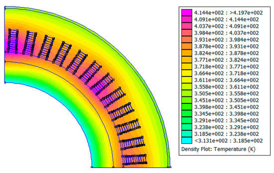 (Step 4) The last step for the generation of initial population is the verification of thermal limits. Using the Equations (14) and (15), the heat transfer coefficients are calculated for an altitude of 100 m and for an appropriate speed of air stream. The solution of thermal problem (16) with the FEA gives the temperature distribution in the main part of the motor. If the maximum temperatures satisfy the imposed maximum value in resin and in the windings, a new element of the initial population is found.