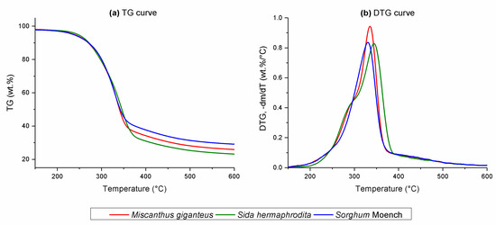 The temperature ranges of hemicellulose, cellulose, and lignin degradation during the pyrolysis process (230–360, 285–380, and 200–600 °C, respectively) determined in this work were consistent with the literature data [38]. It was observed that, for Sida hermaphrodita, with the highest cellulose-to-lignin ratio, maximal decomposition peak on the DTG curve occurred at the highest temperature (344 °C), while for Miscanthus giganteus and Sorghum Moench, with lower cellulose-to-lignin ratios, peaks occurred at lower temperatures (334 and 330 °C, respectively). Biomass composition also affected the total weight loss during pyrolysis—the lowest total weight loss occurred for Sorghum Moench, with the largest lignin and ash content, while the highest total weight loss occurred for Sida hermaphrodita, with the smallest lignin and ash content. Deconvolution of DTG curves allowed us to obtain reliable results on the composition of the energy crops (hemicellulose, cellulose, and lignin), with error below ±1.85%.