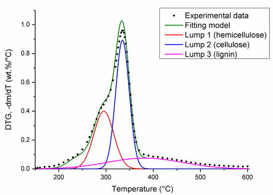 The pyrolysis process of the energy crops involved a multistep-reaction mechanism; therefore, the model-fitting method cannot be used directly. Energy crops are mainly composed of hemicellulose, cellulose, and lignin, which decompose in temperature ranges of 250–350, 325–400, and 200–600 °C, respectively [38]. In order to simplify kinetic analysis and determine the fractions of single reactions in total mass loss, we carried out the deconvolution of DTG curves for three peaks responsible for the degradation of these three constituents. The DTG curves obtained during Miscanthus giganteus, Sida hermaphrodita and Sorghum Moench pyrolysis at a heating rate of β = 10 °C/min were deconvoluted into three pseudocomponents assuming Gaussian distribution. Figure 2 represents the results of the deconvolution of the DTG curve for Miscanthus giganteus. Each peak was described by position (°C), amplitude (wt%/°C), full width at half maximum (°C), and area (wt%) (Table 2).