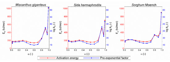 Both Friedmann’s and Ozawa–Flynn–Wall’s analyses are very insensitive for high conversion degrees [44]. Figure 3 and Figure 4 indicate that the values of activation energy and pre-exponential factors for conversion degree α ≥ 0.8 were much higher than those for the lower values of the conversion degree; therefore, they were excluded from further analysis. According to the numerical results of Friedmann’s analysis, the value of activation energy (E) for conversion degree α < 0.8 fluctuated in the ranges of 141.7–202.3, 159.2–209.1, and 170–220.9 kJ/mol for Miscanthus giganteus, Sida hermaphrodita, and Sorghum Moench, respectively. In the case of Ozawa–Flynn–Wall analysis, fluctuations took place in smaller intervals of 153.5–190.5, 171.5–196.3, and 182.6–217.9 kJ/mol for Miscanthus giganteus, Sida hermaphrodita, and Sorghum Moench, respectively. The value of pre-exponential factors (k0) fluctuated slightly for conversion degree α < 0.8 in the range of 109.8–1017.7 1/s for Friedmann’s analysis, and in the range of 1012.4–1017.2 1/s for Ozawa–Flynn–Wall analysis for Miscanthus giganteus, Sida hermaphrodita, and Sorghum Moench.