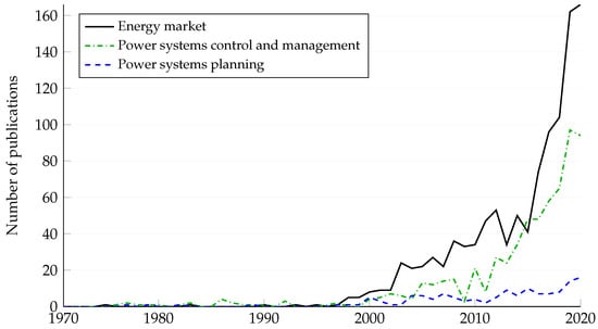The seminal results of game theory were established in the 1950s, whereas the first application of game theory for studying power systems can be found in the 1970s [14,15,16]. Game theory can be divided into two branches: non-cooperative game theory and cooperative game theory [17]. Additional classification can be made in accordance with certain properties, such as the number of stages (static or dynamic games), the structure of information (perfect or imperfect, complete or incomplete), type of strategies (pure or mixed), and so forth [18]. Figure 1 shows the number of publications in applications of game theory in the fields of energy markets and power systems. The search was done in Scopus, which is Elsevier’s abstracts and citations database, and was divided to three different topics: the energy market, power systems management and control, and power systems planning.