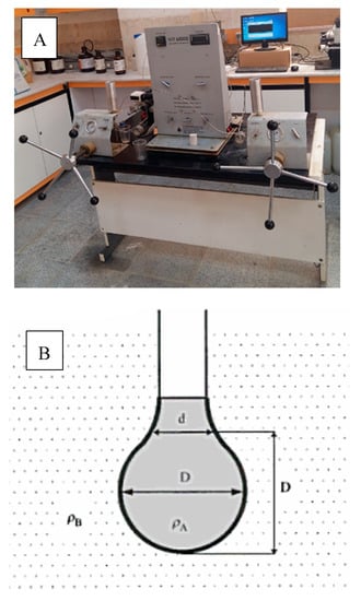 The interfacial tension (IFT) experiments were conducted with the contact angle method to find the tension between two liquid phases at ambient pressure and temperature conditions (by VIT-600 apparatus manufactured by Fars, accuracy 99% as shown in Figure 2a). In this method, a drop of surfactant liquid is dispensed from a needle in the presence of kerosene and all this process is video recorded. This process was repeated with different concentrations of surfactant solutions (100–8000 ppm) and kerosene. The images are taken from a video where the drop is about to leave the needle while making a spherical shape at the tip of the needle. The shape of the drop is due to the relationship between surface tension and gravity. It can be represented by Equation (1) and Figure 2b
