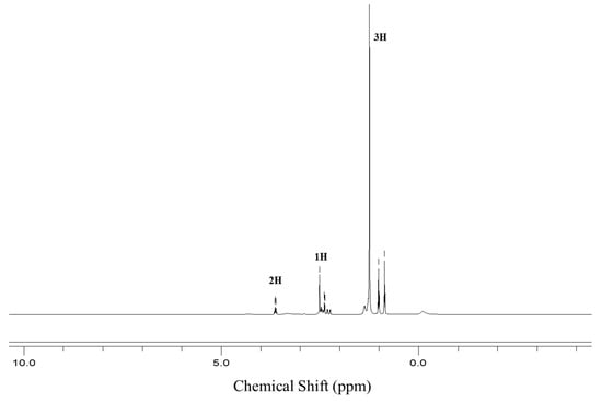 Produced material was purified via ethanol crystallization, thereafter, crystallized powder was extracted at maximum for the melting point by drying it for 24 h at 80 °C. For further quantification, the synthesized powder was characterized by H-NMR and FT-IR [55,56,57]. In the 1H-NMR spectrum (as shown in Figure 5), the appeared peak depicted as 2H represents methylene group of the hydrocarbon tail. The appeared peaks at 3.7 ppm was due to the CH chiral centers near hydroxyl groups and CH2-OH. The presence of a methyl group with amide group showed a triplet peak at 2.6 ppm. Merger of some methylene protons were also noted. The magnetic resonance showed the values at around 2.6 ppm for these protons, represented as 1H. The methyl group of the hydrocarbon tail has also appeared at 1 ppm. Additionally, the triplet spectrum at 1 ppm depicts the methyl group with an integral of 3H. This triplet pattern has two neighboring hydrogen on nearby carbons.
