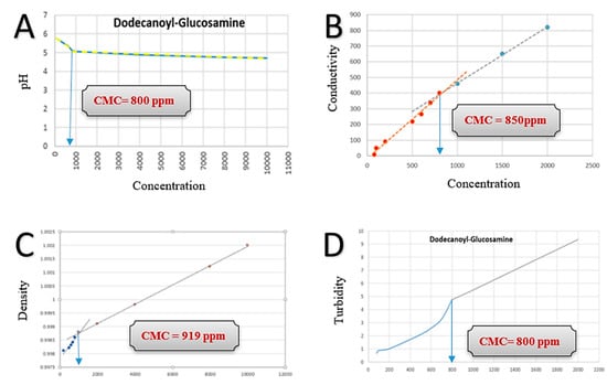 Determination of critical micelle concentration (CMC) of dodecanoyl-glucosamine surfactant via different methods. (A) Potential hydrogen of different solutions, a change in slope referred as the CMC. (B) Electrical conductivity of different concentrations of the solution, a change in the slope as CMC. (C) Density of different concentrations of the solution, a change in the slope as CMC. (D) Turbidity of different concentrations of the solution, linearity in increase in the solution determines the CMC.