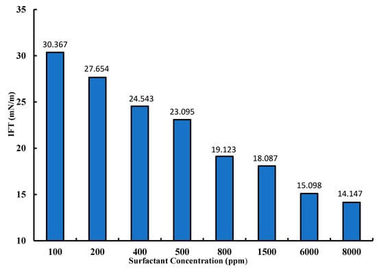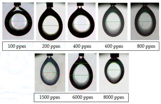 In order to measure the IFT between two fluids, different concentrations of the dodecanoyl-glucosamine surfactant were prepared. The chosen concentrations for this measurement were 100, 200, 400, 500, 800, 1500, 6000, and 8000 ppm. It is shown from Figure 8 that with the increase in surfactant concentration, the values of IFT are decreasing in the presence of kerosene, as also depicted by a previous study [58], where the different concentrations of sodium ethyl ester sulfonate surfactant were synthesized for measurement of IFT reduction in the presence of kerosene. It is shown from the measured values of IFT between the dodecanoyl-glucosamine surfactant and kerosene that IFT values are higher in the higher concentrations, and it rapidly decreases as the concentration of surfactant decreases up to optimum surfactant concentration and, thereafter, the decrease in IFT values is very minimal, as shown in Figure 8. For example, the IFT value for 100 ppm surfactant concentration is 30.367 mN/m, as compared to the 1500 ppm surfactant concentration where IFT value rapidly decreased to 18.042 mN/m. It is also shown from Figure 8 that 1500 ppm is the optimum rapid reduction surfactant concentration value and, after that, the decrease in IFT is very minimal. For instance, at 8000 ppm surfactant concentration, the value of IFT is 14.147 mN/m compared to the 18.0142 mN/m IFT value for 1500 ppm of surfactant concentration. Further, the shapes of droplets in IFT measurements are shown in Figure 9.