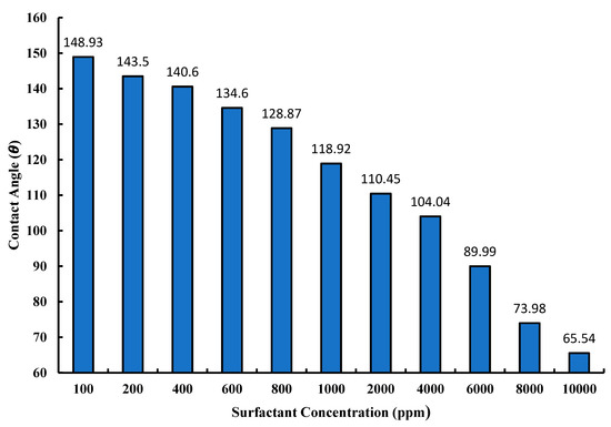 Wettability is a very crucial factor in determining the recovery factor for any reservoir. There are different methods used for measuring the wetting state of rock, but the most-used method is the contact angle method. This method is used to measure the contact angle between wetting and non-wetting phase [59,60,61]. In this study, contact angle values between dodecanoyl-glucosamine surfactant and kerosene were conducted as shown in (Figure 10). The results show that a higher concentration of surfactant produced higher contact angles and, as the concentration of surfactant was reduced, contact angle was also reduced gradually. This is due to the effect of a lower concentration of surfactant solution, which is optimal for lowering the wettability [16,21,22]. For instance, at 10,000 ppm of surfactant concentration, contact angle was measured at 65.54°, whereas at 100 ppm of surfactant concentration, contact angle was at the highest value of 148.93°.