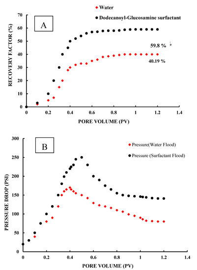 Core flooding results at ambient temperature and condition. (A) Oil recovery percentage versus injected pore volumes for both surfactant and water flooding. (B) Pressure drop curves for both surfactant and water flooding at different injected pore volumes.