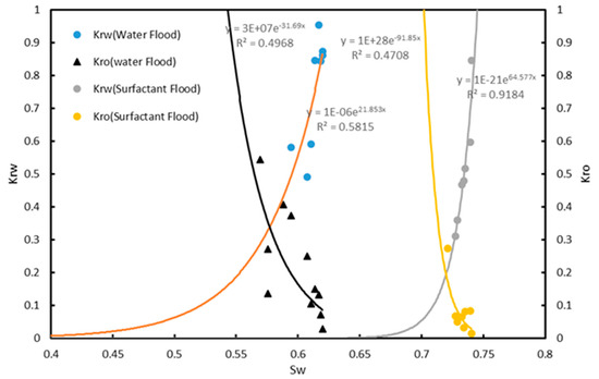 Regarding the results of the conducted flooding experiments conducted in this section, an increase in the final oil recovery factor showed that this surfactant could enhance the oil recovery by the proof of displacement test of core flooding experiment. To obtain further validation on the effectiveness of this material in chemical enhanced oil recovery there is a need to authorize that the reason of this oil recovery increase was the wettability optimization using this surfactant. The Johnson, Bossler and Neumann (JBN) method was applied on the overall pressure drops during the experiment and the effluent phase ratio versus time during two phase displacements to obtain the relative permeability curves. Permeability curves for both flooding experiments (water flooding and surfactant flooding) are shown in the Figure 12 in an integrated manner to enable simultaneous comparison.