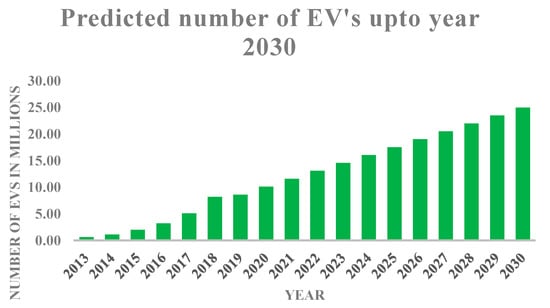 The adoption rate of EVs still varies around the world. However, this adoption can be affected by the vehicle price, total cost of owning EVs, driving experience, the availability of Charging Station (CS), social influence, environmental awareness and others [10]. In [11], it is stated that the popular EV categories: (i) battery-based EVs (BEVs)—complete EVs without any ICE options, and (ii) plug in hybrid EV (PHEV)—EVs that have an ICE option and high storage capacity battery with options of charging, has increased significantly from 2010 to 2016, as shown in Figure 1. Figure 1 also shows the anticipated trends of adoption of EVs until 2030 using the data available from [9].