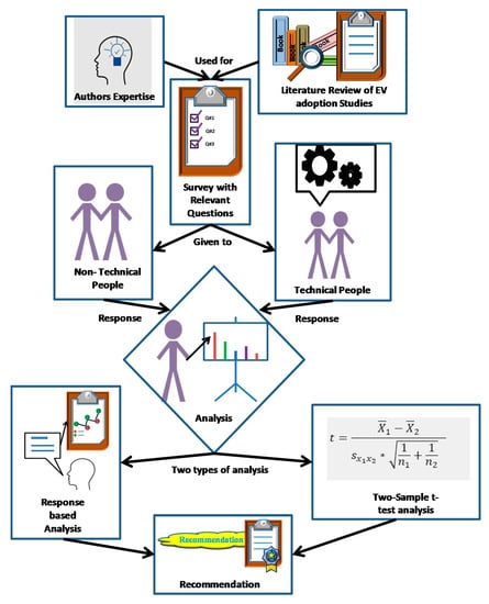 Several regional research works were carried out by different researcher in [9,12,13,14,31,32,33] but the studies do not reflect the possible reasons—according to public perception—as barriers for EV-adoption in a financially stable Middle Eastern country like Qatar. Moreover, the articles do not provide the details of the surveys. Furthermore, detailed analyses of the survey results is not provided in the articles. All these points are addressed in this study. The contribution of this study could be stated as: (i) systematic design of the survey to get two different public perception (technical and non-technical, which will be discussed in details later) of the EV-adoption, (ii) survey result analysis using statistical methods such as two-sample t-test analysis [34,35], (iii) recommendation based on the survey analysis.