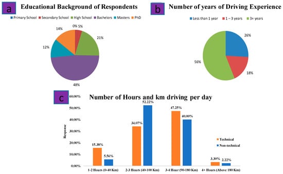 Summary of (a) Educational Background of the respondents, (b) Years of driving experience of the respondents and (c) Number of hours and km of driving per day of the respondents.
