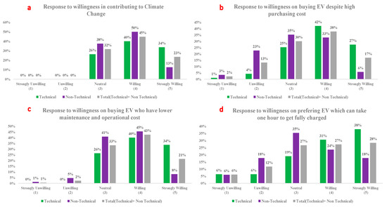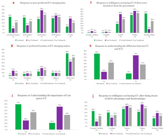 As expected the combined results could have the important information regarding the lack of awareness regarding EVs in general public and can be verified from Figure 5h, (i) where were questions on understanding the difference between EVs and ICE vehicles and understanding the importance of low-power EVs, respectively. Similar comparison could be done in Figure 5a–c where the strong willingness of the technical people to contributing to climate change, buying EVs despite high purchasing cost is evident compared to the non-technical people, and this could have missed if the different perception were not captured. In figures, looking at combined results one could have easily missed the important conclusion that there is lack of awareness about sustainable mode of transportation among the non-technical people. It is evident from the results in Figure 5 and Table 4 that the general public needs to be made more aware regarding the green mode of transportation such as electric vehicles. A majority of the non-technical people was in favor of buying EVs, despite higher initial cost. There were some technical people who were neutral to this question and thus can be assumed that they believe that the prices of EVs can be made lower through research. In the following question where the respondents were informed regarding the low maintenance and operational cost of EVs, the technical people were in majority very positive in buying EVs unlike the non-technical people, but it can be confirmed from Figure 5c that the financial barrier is not a major hindrance to the easy adoption of EVs in Qatar. The response to the question on longer charging time of EVs were not significantly different between the two groups and can be used to assume that awareness for greener mode of transportation despite its lacking can be promoted as they do not have too illogical expectations. This can be considered as a positive sign as the unaware non-technical group were answering similar to the aware technical group and thus people are ready for the various options of charging time. The question on how government incentives can help in EV-adoption had technical people responding positive unlike the non-technical, which can be attributed to their less awareness on how such incentives can help in quick adoption of such green and sustainable mode of transportation. All the respondents replied similarly in preferring charging stations on all locations. There was a clear difference in the response to the question on understanding the difference between EVs and ICE vehicles and the preference of low power EV, which will help in charging in all places. As expected the technical people responded ‘Yes’ to these questions in majority unlike the non-technical group. Finally, a good fraction of both the categories were willing to buy EVs after understanding the advantages and disadvantages of EVs.