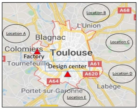 Figure 2 and Table 1 depict the number of engineers participating in this study, the locations where these engineers live and the distance from each location to the design center. These locations were chosen to cover all parts of the city (north, south, east and west of Toulouse) and the number of engineers was assigned depending on traffic conditions in such a way that the more traffic jams were close to the location, the bigger number of engineers was chosen. All vehicles used were equipped with a 40-kWh battery. Their autonomy was close to 250 km. The maximum speed was 144 km/h, and the engine torque was around 320 Nm.