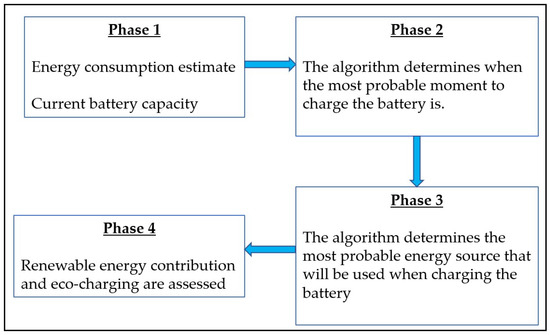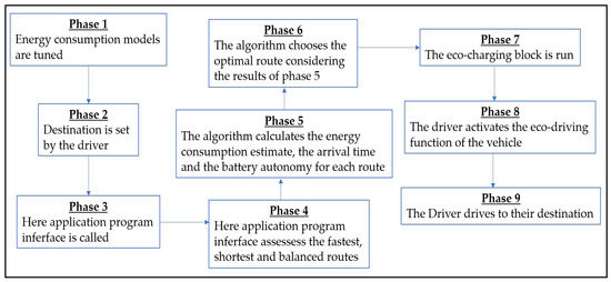 When it comes to the method (Figure 1), two key points must be considered to assess the contribution of ED, EDR and EC to eco-design. The former consists of choosing the optimal locations and the number of engineers participating in this research. The latter shows how the algorithm works and its implementation. To do this, the Here® API was used to determine the best route considering EC, EDR and ER models based on data from the vehicle control unit (VCU), traffic state, drivers’ habits (the way of using the accelerator or brake pedals among other data), current battery capacity and potential recharge needs among others [35,36,37]. In addition, the EC concept shows drivers when a recharge process might be necessary, taking into account when the RE contribution is higher.