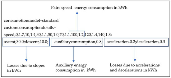 Here® API provides energy consumption models that allow assessing energy consumption by using several parameters such as speed, auxiliary energy consumption (radio, cooling/heating, accelerations, decelerations, etc.). The way of tuning these models implies that the value of each parameter in kWh is provided depending on the speed value (if possible, as not all parameters are linked to speed such as auxiliary systems). In this research, these values were established by performing data acquisition after the drivers participating in this research made each trip 50 times in different periods and traffic conditions (Section 2.2). As shown in Figure 4, the Inca® software installed in a laptop as well as input/output from ETAS® supplier modules were used to perform the data acquisition. Finally, the tuning engineers of the company that collaborated in this study assessed the factors’ values by analyzing the data acquisition by using the MDA® software provided by ETAS® (Stuttgart, Germany) and internal procedures. To introduce this information by using the Here® interface is easy. First of all, the reader must indicate to Here® that the standard energy consumption model will be used. Figure 5 shows an example that helps the reader to reproduce this study. Once these factors are tuned and introduced in the Python code, Here® returns the energy consumption estimate for each type of route (the fastest, the shortest and the balanced one). Consequently, the one with less energy consumption is chosen. Taking into account the initial battery capacity before the trip, the algorithm can determine if a charge is needed during the trip.