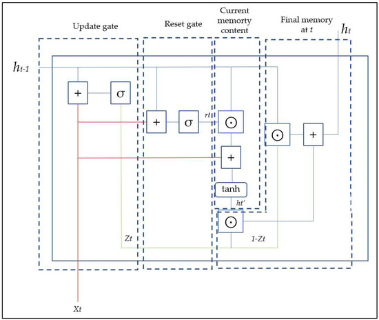 Typical recurrent networks present problems when it comes to long-term predictions due to the vanishing gradient problem. Engineers face this problem when training recurrent neural networks with gradient-based learning methods and backpropagation. When using this method, each of the neural network’s weights receive an update proportional to the partial derivative of the error function with respect to the current weight in each iteration of training. In some cases, the gradient will be vanishingly small. Consequently, the weight does not change its value, and might stop the neural network training. To enhance long-term predictions, long short-term memory or GRU can be used. In this research, GRUs have been chosen, as they are more efficient (they require less memory). GRU is a recurrent neural network architecture that uses update and reset gates (Figure 7).