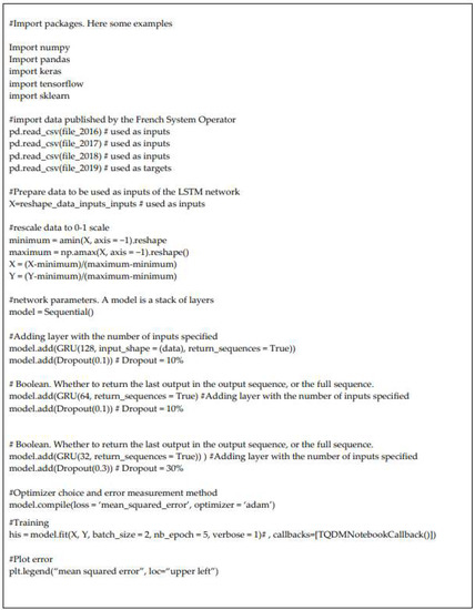 The GRU network was coded in Python. Figure 8 shows the pseudocode. To reproduce the results, the reader must have the data published by the French system operator for the last four years. The first three-year data are used for inputs of the network and the last-year data are employed as targets to train the network. It is of paramount importance to rescale all data to make them range between 0 and 1 to assure the network performance. The network parameters are set up by using the keras package. First of all, with the Sequential parameter, the code specifies that the model is sequential, and the output of each layer is the input for the next layer. In this study, the authors have used the Dropout function which is a technique where randomly selected neurons are ignored during training. This means that their contribution to the activation of downstream neurons is temporally removed on the forward pass and any weight updates are not applied to the neuron on the backward pass. The main advantage of this technique is that the network becomes less sensitive to the specific weights of neurons. The method used to analyze the error loss is the mean squared error which is widely recommended for regression problems. The method used to optimize the model is Adam which is an optimization algorithm that can be used instead of the classical stochastic gradient descent procedure to update network weights iteratively based on training data. It offers many advantages such as straightforward implementation and computational efficiency, among others. Other comments can be found in the pseudocode (Figure 8).