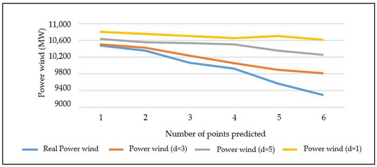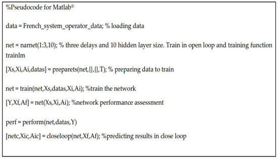 where f represents the network response taking into account the previous input data, and ε(t) is the difference between the predicted value and the actual y. The number of delays establishes the d values to be considered for the prediction. The number of hidden layers and neurons per layer is flexible to achieve the best performance of the neural network under design. This number must be carefully chosen to avoid an increase in the neural network complexity. The effect of choosing the value of the delay parameter is shown in Figure 10. As one can see, a high d implies that the predicted line series line changes slower. On the other hand, when d is lower, the predicted line series follows the real power wind value more accurately. However, if d takes a very low value, then the predicted line series does not follow the real power wind value. The main explanation is that d determines the weight given to past values. Consequently, significant changes in trend are not detected which could happen due to weather conditions. That is why, NAR networks are used in this research as an estimation and the accuracy remains on GRU networks. Anyway, this is not an issue as Matlab® allows correcting predictions if predicted values are known. This is the case of this application as it can predict t + 1, t + 2, t + 3… at a specific moment t. However, when the moment is t + 1, the neural network can be updated as the predicted t + 1 value and the real t + 1 are known in real time (the French system operator publishes the needed data in real time). To reproduce the results of this study, the authors obtained good predictions for the next 2 h with d = 3 when using the data belonging to 2019 published by the French system operator. The pseudocode of the NAR network is shown in Figure 11, coded by using Matlab® (Natick, MA, USA) The NAR networks were trained by using the trainlm function which implies that bias and weights are updated according to Levenberg–Marquardt optimization. It is the fastest backpropagation algorithm even if it may require more memory than other methods.