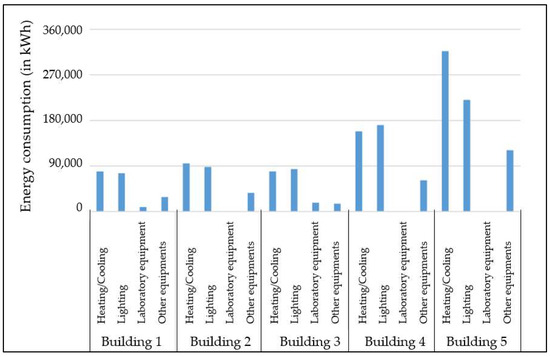 Figure 13 depicts the energy consumption for each building. These values were obtained by using electric meters installed in the design center, the number of hours of operation considering timetables and average energy consumption of facilities/items. The main differences between these buildings were the number of people working, which affects the number of other elements present in the buildings such as printers, and the presence of laboratories.
