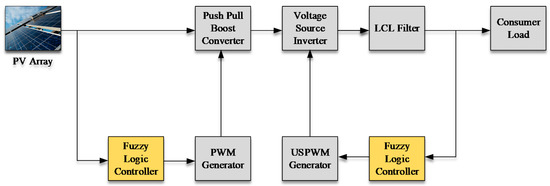 In this paper, a fuzzy logic controller is employed for MPPT to overcome the aforementioned shortcomings by tracking the maximum power point (MPP) in real time. Fuzzy logic based control offers an advantage in that it does not oscillate near the MPP [31,32]. This kind of control is unique for push pull current-fed boost converters where the high frequency transformer is used to provide the galvanic isolation between the input and output side along with a high conversion ratio [33,34]. DC voltage is inverted to AC through a voltage source inverter (VSI) with a fuzzy logic closed loop controller, which improves the power quality of the AC voltage and provides very low THD. In this work, 5% THD is considered, which is tolerable according to the Institute of Electrical and Electronics Engineers (IEEE) standard [35].