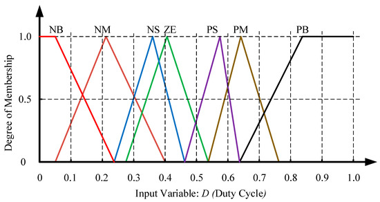 In the defuzzification process, fuzzy logic controllers use the fuzzy rules to obtain the output value. This output value of the fuzzy logic controller depends upon the method of defuzzification. Hence, it is the gained value of a fuzzy logic controller with respect to the label value in the fuzzy logic membership function. Seven fuzzy membership functions were used in this research, as enlisted in Table 1. These seven functions are negative big (NB), negative medium (NM), negative small (NS), zero (ZE), positive small (PS), positive medium (PM), and positive big (PB). During the defuzzification, the FLC converts the fuzzy logic value into a data value. Numerous methods are available for the defuzzification process such as the average weight (AW) method, center of gravity (COG), mean of maximum (MOM), and smallest of maximum (SOM) [30]. The COG method is used for MPPT in which all fuzzy values are converged at one point [26]. The fuzzy logic rules are used in the push pull boost converter design for MPPT, which is given in Table 1 [42].