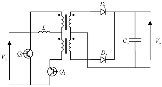 The push pull converter consists of a centrally tapped transformer, two push pull switches Q1 and Q2, series inductor L, two rectifier diodes D1 and D2, and a parallel capacitor C0, as shown in Figure 7. Push pull converter can operate in four states. By applying PWM, the designed inductor and specifications of load ensure that the converter always operates in the continuous conduction mode (CCM) [36,42].