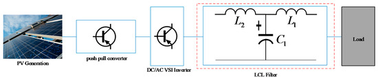 In the proposed system, a single-phase full bridge inverter is used to feed the consumer load, which inverts the 340 V DC into 220 V AC at 50 Hz frequency. The unipolar sinusoidal pulse width modulation (USPWM) technique is used to turn on/off the inverter switches. This technique reduces THD and power losses during switching [26]. In USPWM, two control signals are used: a sinusoidal wave and its 180° out of phase version at 50 Hz. These control signals are compared with high frequency triangular carrier signal of 10 kHz. Control signal 1 is compared with the carrier signal, resulting in a logic signal that generates the output voltage between 0 and +Vdc. Control signal 2 is compared with the carrier signal, resulting in a logic signal that produces the output voltage between 0 and +Vdc. In every inverter, a filter is necessary for improving power quality. Therefore, a low pass filter is used for smoothing the output current from VSI. The LCL filter is shown in Figure 8.