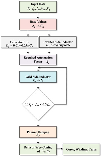 For LCL filter, derived parameters are L1 = 9.3 mH, L2 = 37.5 mH, and C = 1.6 μF with the unity power factor. The LCL filter designing algorithm is shown in Figure 9. After the filtration, (root mean square) RMS output voltages are sensed for the fuzzy logic controller input. The output of the controller is compared with the sinusoidal AC voltages at the fundamental frequency, and then PWM set the duty of VSI.