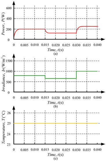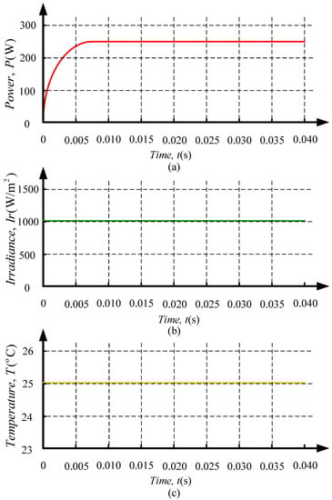 In the first case, the system is simulated at a constant temperature of 25 °C and constant irradiance 1000 W/m2. It tracks the maximum power 250 W in a very small amount of time, approximately 0.005 s, as shown in Figure 11.