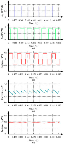 Output: (a) Fuzzy logic PWM; (b) transformer output; (c) inductor current; (d) DC output voltage.