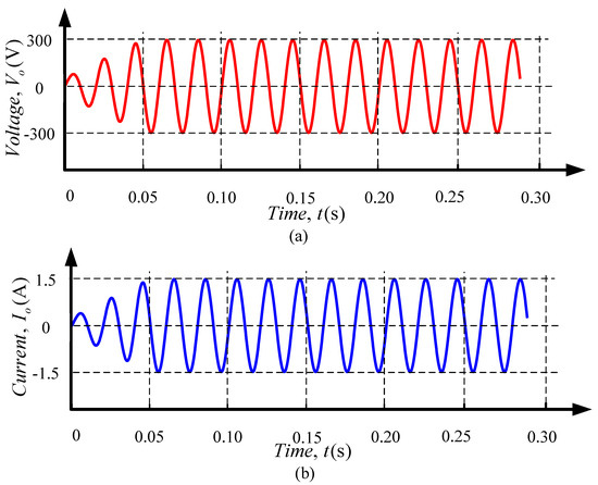 The DC voltages are inverted into 220 V AC through the VSI. These voltages are sensed through the voltage sensor and compared with the sinusoidal AC voltages; error and change in error are calculated for fuzzy FLC. This controller generates the reference signal for the PWM generator, which operates the inverter switches and is operated according to the fuzzy logic controller. The PWM of the inverter is shown in Figure 14a. FLC generates the reference signal by using the fuzzy rules of Table 3, settled down by removing the lower order harmonic content in AC voltages. However, these voltages still have the higher-order harmonic content shown in Figure 14b. The higher-order harmonic contents are removed through the low pass filter. The output voltages and current of inverter after removing the higher-order harmonic content are shown in Figure 15, where Figure 15a presents the AC voltages and Figure 15b shows the AC current, which is 1.5 A.