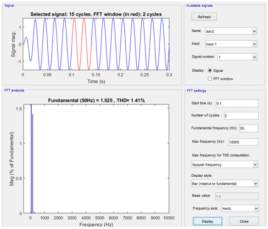 To check the quality of output voltages and current, the fast Fourier transform (FFT) analysis is also carried out and obtained THD are shown in Figure 16 and Figure 17. The FFT analysis of the proposed algorithm provides only 1.41% THD for output voltage and current at 50 Hz.