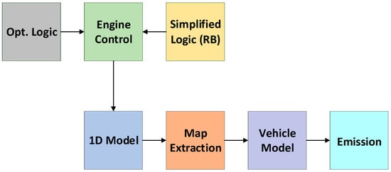 The previously described optimization procedure is too time consuming to be directly employed to compute the complete engine performance map. To speed up the numerical calibration, a set of heuristic rules were defined to reproduce as best as possible the behavior of the mathematical optimization (rule-based calibration). The RB was applied by including a network of logical switches, PID controllers, and “math functions” in the 0D/1D environment.