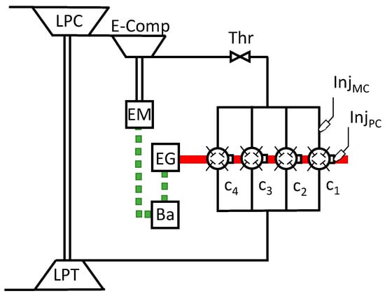 The engine is fed with liquid gasoline through four port fuel injectors located just upstream the intake valves (InjMC), and four direct injectors located into each PC (InjPC). A two-stage boosting system provides the needed boosting level to match the prescribed load target. It is composed by a variable geometry turbocharger (LPC and LPT) and a high-pressure (HP) compressor (E-Comp), driven by an electric motor (EM). An electric generator (EG) mounted on the engine shaft provides the electrical energy to recharge the battery (Ba) and to power the EM. The electric fluxes are shown as a dashed line in Figure 2.
