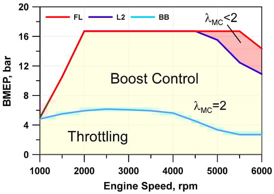 Preliminarily, a prefixed running line was chosen on the LPC map as a tradeoff between an appropriate surge margin and a suitably high-pressure ratio to avoid an excessive E-Comp shaft power absorption (below 10 kW). Under these operating conditions, the E-Comp running line was directly identified to reach the HP boost level necessary to fulfill a prescribed full load (FL) target, depicted in red in Figure 3. By changing the LPC running line, a different sharing of the overall boost level between the LPC and the E-Comp would have been accordingly identified. However, whatever the choice for the LPC running line, at very high engine speeds (usually over 4500 rpm) for the selected boosting devices, the constraints on the maximum E-Comp power and/or maximum boost level could not be fulfilled. For this reason, the only way to achieve the FL target was to inject more fuel in the main chamber, resulting in a λMC < 2. The L2 line in Figure 3 identifies the BMEP region below which a λMC = 2 operation can be sustained (light yellow domain), while the area above the L2 line defines the operating domain with λMC < 2 (highlighted in orange).