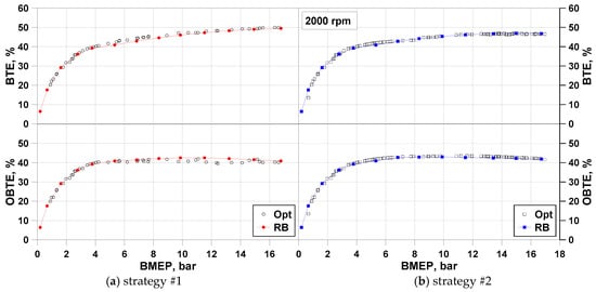 Figure 4 reports the comparisons of BTE and OBTE at 2000 rpm for the considered calibration strategies (#1 and #2). In both cases, a considerable agreement was realized along the BMEP sweep between Opt and RB procedures. Figure 4 also shows the potentiality of the analyzed engine architecture to reach a very high BTE level of about 50% at the higher load. In the latter conditions, lower OBTE is reached due to the relevant power request by E-Comp (see OBTE definition in Equation (5)). Indeed, OBTE assumes a maximum value around 42% at medium loads, with a slight reduction at the highest BMEP levels.