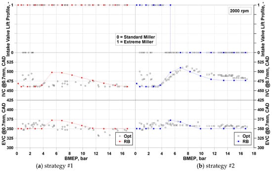Quite satisfactorily, RB/Opt agreements were found for the most relevant engine calibration variables depicted in Figure 5 and Figure 6. The first assessment regards the intake valve strategy and the intake/exhaust valve timings, which are plotted in Figure 5. Considering the strategy #1, the Extreme Miller was mainly preferred all along the BMEP sweep, while in the strategy #2 at medium/high loads, the Standard Miller strategy was chosen.