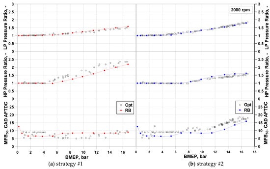 Low/High pressure ratios and MFB50 comparison in a BMEP sweep at 2000 rpm for strategies #1 (a) and #2 (b).