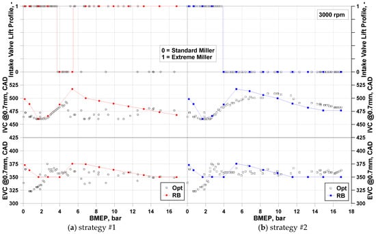 Intake valve lift profile, IVC, and EVC comparison in a BMEP sweep at 3000 rpm for strategies #1 (a) and #2 (b).