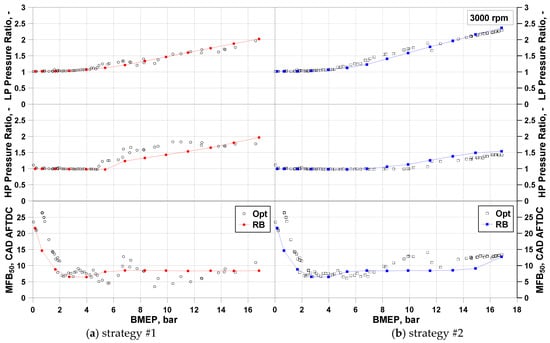Low/High pressure ratios and MFB50 comparison in a BMEP sweep at 3000 rpm for strategies #1 (a) and #2 (b).