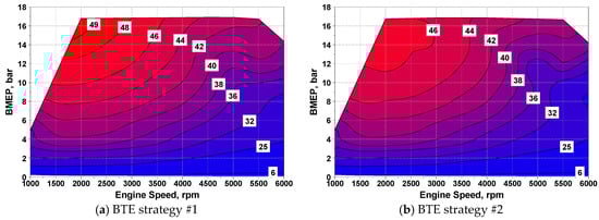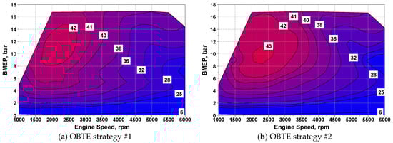 According to the RB control strategy, the entire engine operating map was computed (consisting in 143 operating points—11 rpm × 13 BMEP) for the two different calibration strategies above discussed. In Figure 9, the BTE maps for calibration strategies #1 (a) and #2 (b) are shown. The maximum levels for both strategies occur at 2000 rpm, close to the full load region. The OBTE maps for the different strategies are shown in Figure 10. For these, the maxima occur at medium speeds (2000–2500 rpm) and medium–high loads (8–14 bar BMEP). According to the selected optimization targets, a 3% higher peak BTE was obtained in the strategy #1 (Figure 9a), while a 1% higher peak OBTE was obtained in the strategy #2 (Figure 10b).