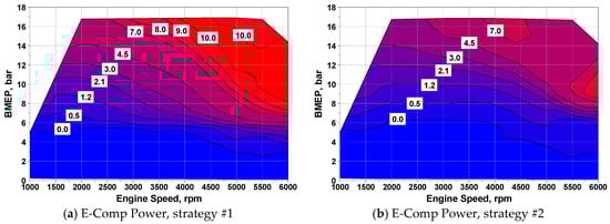 The gap between BTE and OBTE for the strategy #1 was about 7% in the OBTE peak zone, and gradually decreased at higher speeds and low loads. A similar behavior characterizes the strategy #2, having in the peak zone a gap of about 3–4%. This is due to the power absorbed by the E-Comp, whose maps are reported in Figure 11. For strategy #1, the E-Comp power gets to the upper bound of 10 kW, which is about the 8% of the power rated by the engine, while for strategy #2, it only gets a maximum of about 7 kW.