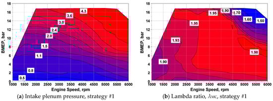 Map of intake plenum pressure (bar) (a) and (b) map of λMC (-) for strategy #1.