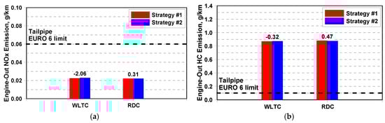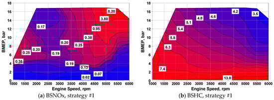 Map of (a) brake specific NOx emission (g/kWh) and (b) map of brake-specific HC emission (g/kWh) for strategy #1.