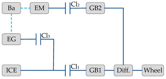 The main characteristics of the vehicle here investigated are reported in Table 2 []. The vehicle is a HEV, belonging to the C-class. It is characterized by a combined parallel/series powertrain, schematized in Figure 14. The powertrain is composed of an ICE, two electric motor/generator units, (EM and EG), a battery (Ba), three clutches (Cl1–3) and two gear boxes (GB1–2).