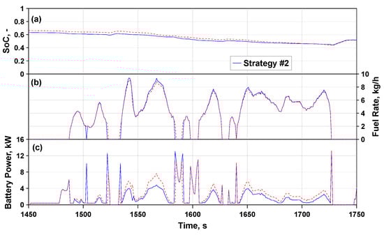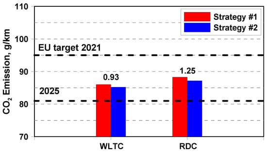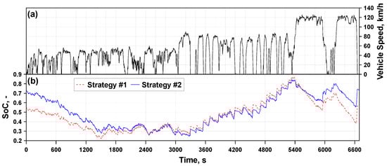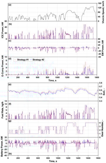 The vehicle simulations were carried out by a “in-house developed” software, implemented in Fortran language (UniNa Vehicle Simulation-UNVS) []. It is based on a “backward-facing” (quasi-static) method []. All of the powertrain schematic components in Figure 14 were defined by a lumped-parameter method. The approach to describe the thermal unit was quasi-steady map based. In particular, the BSFC maps, derived from the calibration strategies #1 and #2, were implemented in the vehicle simulation, together with the curve of maximum shaft torque. In addition to the BSFC maps, the vehicle model handled the corresponding E-Comp power consumption maps. The electrical absorption of the E-Comp is considered as an additional load on the battery. The ICE thermal transient was neglected in the simulations, resulting in a null fuel consumption penalization at the cold start. The exhaust gas after-treatment system was not modeled, so the predicted emissions have to be considered as “engine-out” values. The electric unit efficiencies were described once again by a map-based approach, dependent on speed and shaft torque. The battery was treated by a conventional State of Charge (SoC) model []. In order to estimate the Joule-effect losses, an internal resistance was set, neglecting the possible variations in changing SoC and temperature. The mechanical losses in the gearboxes were evaluated assuming constant efficiencies (equal to 0.97).