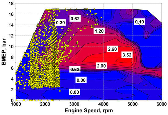 The logical scheme of the optimization process was already reported in a previous author’s work [], and here it is partially modified by the addition of SML/EML and EVC (exhaust valve closure) variables. The optimizer algorithm, at each step with an iterative process, selects the eight engine control variables, passing them to the 1D engine model to evaluate the variables of interest. At the end of each simulation, the estimated values of the objective function are returned to the optimizer to start the next iteration. This process pursues as long as the optimal levels, being part of the Pareto frontier, are achieved.