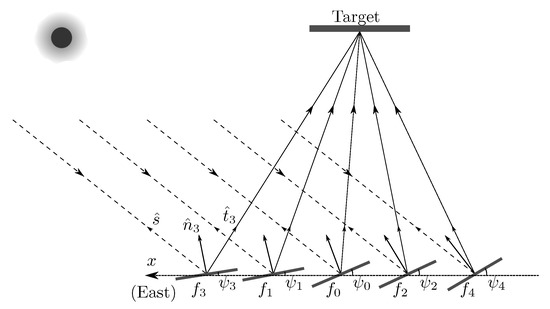 With the previous analysis, the required tracking angles of the central facet and are calculated as a function of time, according to the required evolution of the normal vector, predicted by Equation (4). It only remains to determine the necessary canting angles of the lateral mini-heliostats .