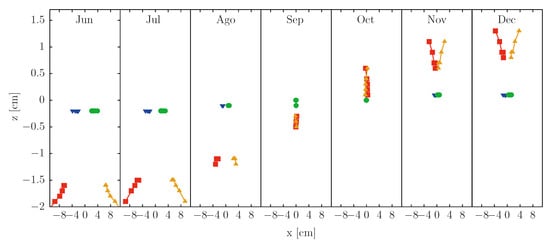 Figure 5 presents the behavior of impact points for the 21st day of each month, from June to December (note that the annual behavior is symmetrical around June). It is interesting to observe how the impact points of symmetric heliostat pairs switch sides throughout the year. The minimum dispersion occurs on the day of canting, 21 March/September, where the solar declination is zero. The maximum dispersion occurs in June. Values of 11.8, 15.1, and 19.6 cm, on the x axis, and −2.1, −1.1, and −0.6 cm, on the z axis, are obtained for the positions 0.75h, 2h, and 4h, respectively.